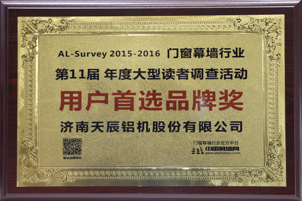 同期,由中国建筑金属结构协会主办,中国幕墙网承办的“第十一届AL-Survey2015-2016中国幕墙网年度大型读者调查评选活动”颁奖仪式在在广州广交会威斯汀酒店隆重举行,天辰股份荣获“用户首选品牌奖”。